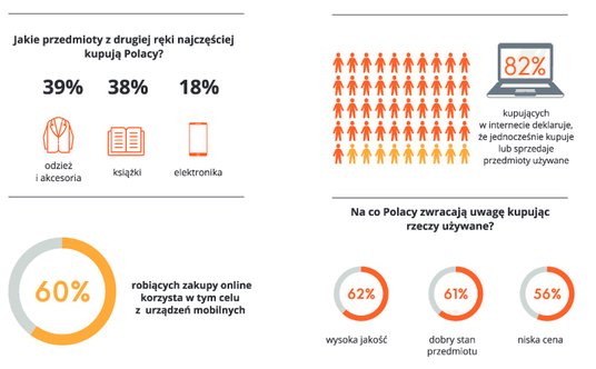 Poszukując rzeczy z drugiej ręki, Polacy najczęściej decydują się na zakupy online. Zarówno wśród kobiet, jak i mężczyzn na podium znajdują się ubrania i książki. Najczęściej zwracamy uwagę na trzy czynniki – dobrą jakość (62 proc.), stan przedmiotu bez widocznych śladów użytkowania (61 proc.) oraz niską cenę (56 proc.).