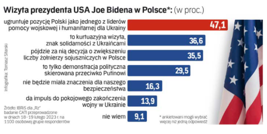 Niemal co trzeci pytany (35,5 proc.) zakłada, że efektem wizyty będzie zwiększenie liczby żołnierzy sojuszniczych w Polsce. Po rozpoczęciu pełnoskalowej wojny zwiększyła się obecność wojsk amerykańskich w naszym kraju. Teraz przebywa co najmniej 11,5 tys. żołnierzy z krajów NATO.