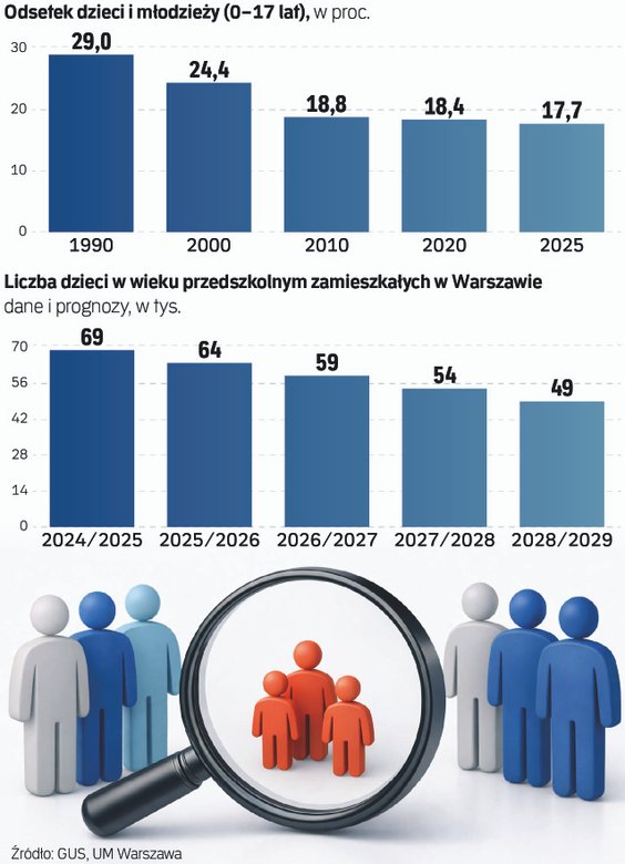 Jak wskazuje GUS, na koniec 2025 r. liczba mieszkańców naszego kraju poniżej 17. roku życia wyniosła 6,6 mln. Czyli przez ostatnie ćwierć wieku zmniejszyła się o 2,7 mln osób. „Analiza procesów demograficznych wskazuje, że sytuacja demograficzna Polski nie ulegnie znaczącej zmianie. Utrzymujący się od około trzech dekad niski poziom dzietności będzie nadal wpływał na niską liczbę urodzeń, zwłaszcza w kontekście systematycznego zmniejszania się liczby kobiet w wieku rozrodczym” – podkreśla GUS.