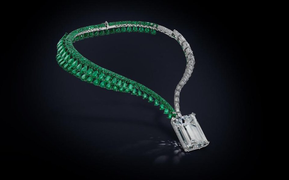W naszyjniku o nazwie „The Art of de Grisogono" oprawiono go w białe złoto i szmaragdy.
