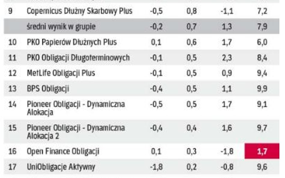 Taka sytuacja nie zdarza się często. Spośród prawie 120 funduszy, które prezentujemy w naszym zestawieniu, jedynie 10 odnotowało stratę w ciągu minionych 12 miesięcy. Wszystkie fundusze, które znalazły się na minusie, to przedstawiciele grup uważanych za względnie bezpieczne. Mowa o funduszach obligacji (siedem pod kreską) oraz gotówkowych i pieniężnych (trzy odnotowały straty).