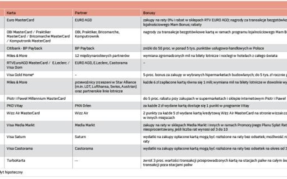 Nie wszystkie plastiki wydawane we współpracy z partnerami spełniają swoją funkcję. Jest ich zresztą coraz mniej. Credit Agricole np. zamienił kartę kredytową Visa Castorama na kartę Visa Dom, która niczym się nie różni od zwykłych kart kredytowych. Korzyści z niej są jednak niewielkie: upustów brak, specjalnych bonusów brak, a zadłużyć się można na maksimum 10 tys. zł.