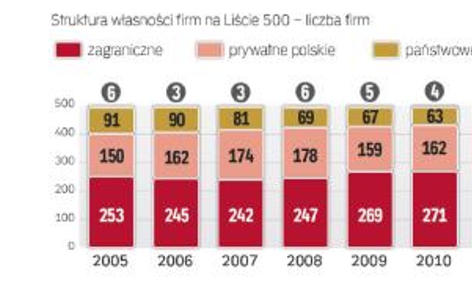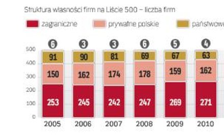 W tegorocznej edycji Listy 500 struktura własnościowa nie uległa znaczącej zmianie, notowane są 33 spółki państwowe, o jedną mniej niż rok temu. Jeszcze dziesięć lat temu było ich prawie trzykrotnie więcej, co pokazuje skalę przeprowadzonych prywatyzacji. Obecny rząd zamroził jednak sprzedaż państwowego majątku, a co więcej, chce go odbijać z rąk zagranicznych inwestorów. Doskonale widać to po roli PZU (poz. 7.), które stało się państwowym inwestorem. Spółka za swoje pieniądze najpierw kupiła pakiet akcji Alior Banku (poz. 15.), dający je de facto kontrolę nad firmą, a niedawno podpisała umowę na zakup aktywów Banku BPH (poz. 220.) od amerykańskiego GE. To pewnie nie koniec, na sprzedaż wystawiony jest również Raiffeisen Bank (poz. 127.) w Polsce, podobne informacje krążą również na temat portugalskiego Millennium Banku (poz. 102.).