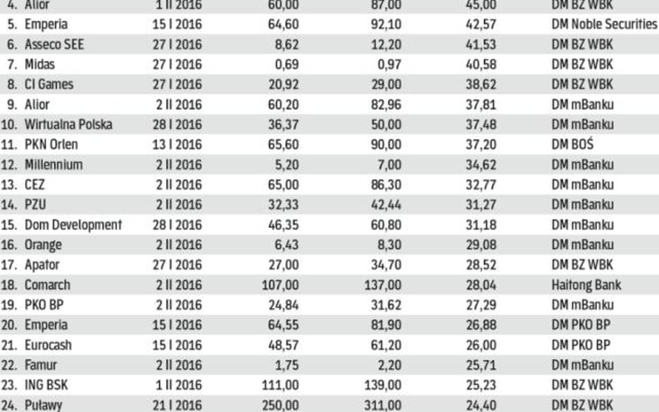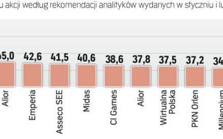 Giełdowe notowania nie napawają optymizmem. Od początku roku do końca pierwszej dekady lutego WIG stracił na wartości 3,5 proc., WIG20 – 2,5 proc., WIG30 – 2,7 proc. a mWIG – 5,7 proc. Mimo to spośród ponad 200 rekomendacji wydanych w tym czasie dla giełdowych spółek niemal połowa zaleca kupno akcji. Prognozowany zysk też działa na wyobraźnię. Mniej więcej w ciągu roku na papierach niektórych spółek mamy szansę zarobić kilkadziesiąt procent (o ile sprawdzą się prognozy).