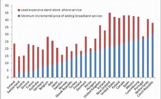 , że średnia cena pakietu trzech usług telekomunikacyjnych w 2009 r. w krajach OECD wynosiła 65 dolarów (z uwzględnieniem parytetu siły nabywczej). Internet w pakiecie było o 26 proc., czyli 15 dolarów miesięcznie tańszy w porównaniu do usługi sprzedawanej samodzielnie. Ceny