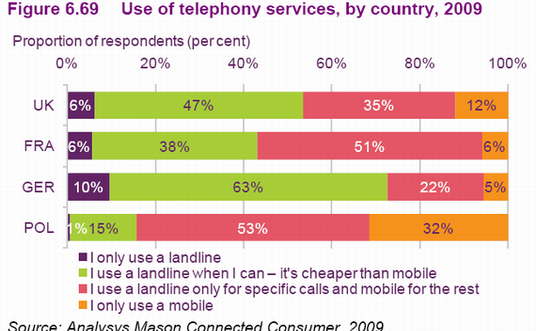 Aż 32 proc. Polaków dzwoni tylko z telefonów komórkowych. 85 proc. korzysta z obu typów łączności – stacjonarnej i komórkowej - ale preferuje komórki. Dla Niemiec oba te wskaźniki wynoszą odpowiednio 5 proc. i 27 proc., dla Francji 6 proc. i 57 proc., a dla Wielkiej Brytanii 12 proc. i 47 proc. Na tle innych krajów polski rynek komórkowy jest wyjątkowo silny względem segmentu stacjonarnego.