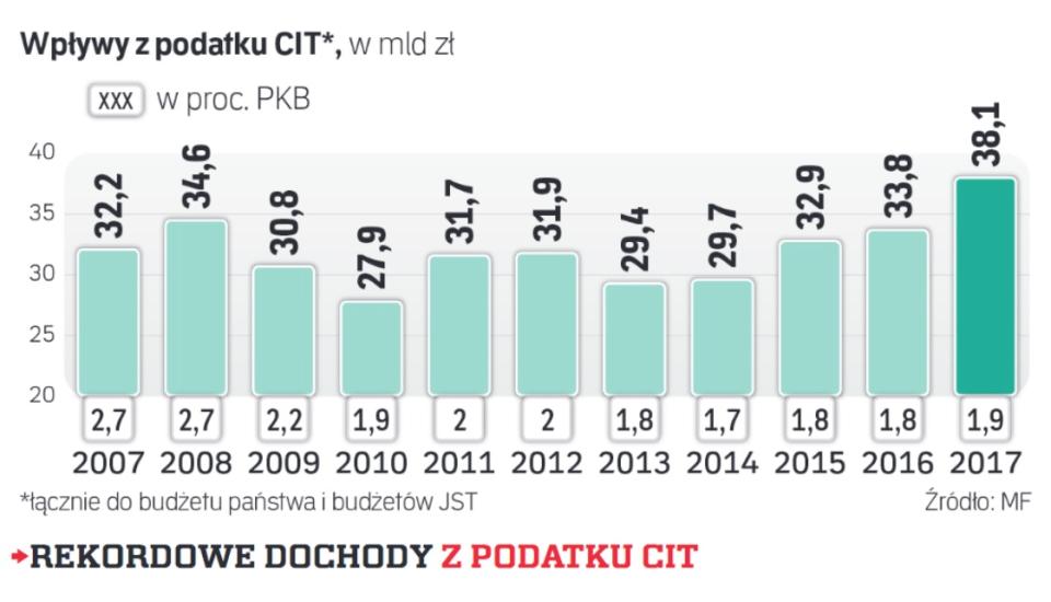 Jeśli chodzi o dynamikę wzrostu, można mówić o imponującym wyniku, bo CIT rósł szybciej niż cała gospodarka – PKB wzrósł nominalnie o 6,6 proc. W ciągu ostatnich 10 lat taka sytuacja zdarzyła się tylko trzy razy, przez większość czasu wpływy z tego podatku spadały zarówno nominalnie, jak i w relacji do PKB.