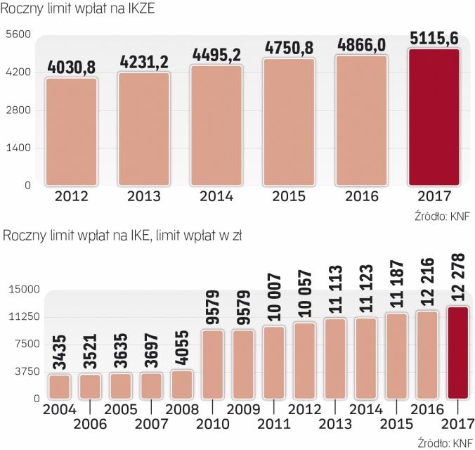 Co roku ustanawiane są odpowiednie limity na oba konta. Dla IKE jest to trzykrotność przeciętnego prognozowanego wynagrodzenia miesięcznego w gospodarce narodowej na dany rok. Dla IKZE to 1,2- krotność tej kwoty. W tym roku na IKE możemy zatem wpłacić maksymalnie 12 789 zł, zaś w roku 2018 będzie to 13 329 zł. W przypadku IKZE to 5115,6 zł, a w roku 2018 limit wynosić będzie 5331,60 zł.