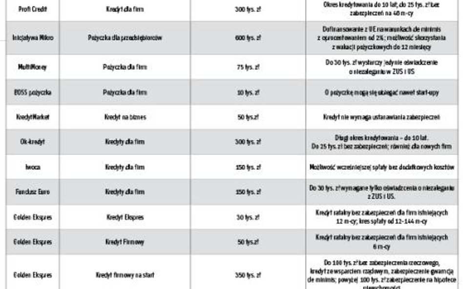 Profi Credit nowym firmom pożycza do 15 tys. zł, starszym do 25 tys. zł. Krakowski Lemon Finance oferuje pożyczki początkującym firmom bez ZUS i US do 30 tys. zł. W MultiMoney do 30 tys. zł potrzebne jest tylko oświadczenie o niezaleganiu w ZUS i US. Na pożyczkę mogą liczyć również mikroprzedsiębiorstwa, które często są zaniedbywane przez banki, a popyt z ich strony na dofinansowanie jest duży.