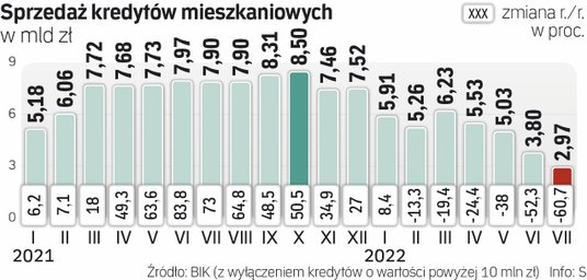 Problem jest palący. Sierpień to bowiem kolejny miesiąc prawdziwego pogromu na rynku kredytów mieszkaniowych. Według szacunków Biura Informacji Kredytowej banki i SKOK-i otrzymały 12,4 tys. wniosków o udzielenie takiej pożyczki, aż o 71 proc. mniej niż rok wcześniej i ponad 12 proc. mniej niż w lipcu. To najsłabszy wynik od stycznia 2007 r., kiedy BIK rozpoczęło monitorowanie rynku. Średnia wartość wnioskowanego kredytu mieszkaniowego w sierpniu br. wyniosła prawie 337 tys. zł, o 2,8 proc. mniej rok do roku i 0,9 proc. mniej miesiąc do miesiąca.