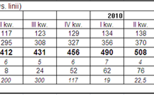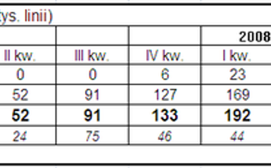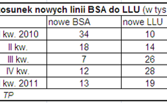 Jednocześnie w I kw. 2011 r. wzrosła o 19 tys. (15 proc.) liczba linii LLU, z których głównie – ale znowu nie tylko – korzysta Netia. Warto przy tym zauważyć, że trzeci kwartał z kolei przybyło więcej nowych linii LLU, niż BSA (Netia migruje abonentów pomiędzy obydwoma platformami).