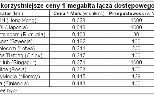 Liderami rankingu są azjatyckie telekomy z Hong Kongu i Japonii, gdzie standardem rynkowym są łącza w optycznych sieciach dostępowych, oferujące gigabitową przepustowość. Co ciekawe, na trzecim miejscu znalazł się rumuński operator narodowy [b]Romtelecom[/b], który oferuje tylko 30 Mb/s, ale za okazyjną cenę 6-8 euro miesięcznie.