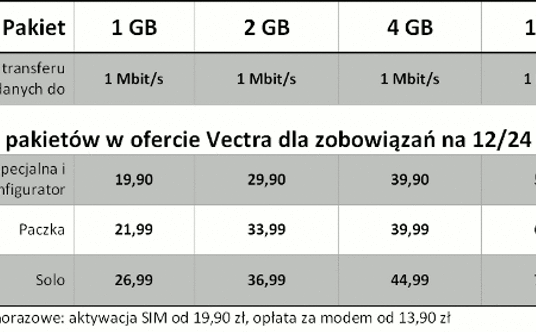 [b]Vectra[/b] nie ogranicza nowej oferty wyłącznie do abonentów własnych usług stacjonarnych. Sprzedaje mobilny internet również jako samodzielną usługę. Ceny zaczynają się od 19,90 zł brutto miesięcznie (dla abonentów), a pakiety transferów danych wynoszą od 1 GB do 10 GB danych miesięcznie. Prędkość transmisji ograniczona jest (a przynajmniej tak komunikuje operator) do 1 Mb/s downloadu oraz do 384 kb/s uploadu.