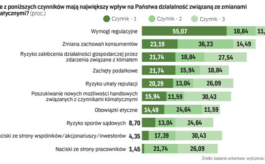 Incydentów związanych z kwestiami klimatycznymi obawia się niemal 83 proc. przedsiębiorstw. Obawa ta dotyczy przede wszystkim przedsiębiorstw z branży motoryzacyjnej, naftowej i gazowej oraz wydobywczej, ale również z sektora energetyki i mediów oraz IT czy FMCG. Coraz częściej na to ryzyko zwracają również uwagę instytucje finansowe. Ponad 26 proc. badanych członków zarządów twierdzi także, że w pełni rozumie wpływ swoich organizacji na zmiany klimatyczne, a spółki powinny ponosić za ten wpływ odpowiedzialność.