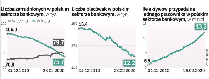 Na koniec lutego w bankach było 156 tys. etatów, o 20,9 tys. mniej niż na koniec 2010 r., co oznacza spadek o 11,8 proc. Oprócz malejącej liczby etatów widoczne jest jeszcze inne zjawisko – zmienia się struktura zatrudnienia – przybywa pracowników w centralach, ale w oddziałach jest ich coraz mniej. To, że za redukcję liczby zatrudnionych w sektorze odpowiadają oddziały, widać też po malejącej ich liczbie. Z końcem 2012 r. KNF zmieniła metodologię jej określania i od tego czasu wszelkiego rodzaju placówek banków (oddziałów, filii, przedstawicielstw i innych) ubyło o 3,17 tys., czyli 20,6 proc., i jest ich 12,2 tys. Jednocześnie rosły aktywa i wskaźnik pokazujący wartość aktywów na liczbę etatów czy placówek szedł w górę.