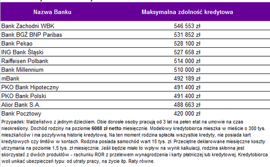 Do obliczeń przyjęto, że dwie osoby powinny otrzymywać „na rękę” kwotę 6088 zł (każdy z rodziców zarabia po średniej krajowej). Modelowi kredytobiorcy mają dobrą historię kredytową i obecnie nie są zadłużeni.
