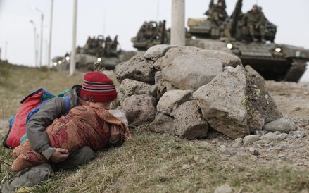 Film otwiera kręcona przez rosyjskiego żołnierza amatorską kamerą scena egzekucji muzułmańskiej rodziny. Obserwuje ją przez okno mały Hadji (świetny Abdul-Khalim Mamatsujew). Gdy Rosjanie się wycofują, ucieka z braciszkiem niemowlakiem na rękach i dołącza do tłumu uchodźców.