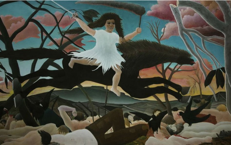 W 1890 roku Rousseau namalował autoportret przedstawiający go tak, jak sam siebie postrzegał – pewnego siebie artystę na tle wieży Eiffla. Nie umiał jednak należycie namalować stóp, ani zapanować nad perspektywą. Infantylna technika jest dowodem na braki warsztatowe: proporcje są zachwiane, widać trudności z umieszczaniem sylwetek w przestrzeni.