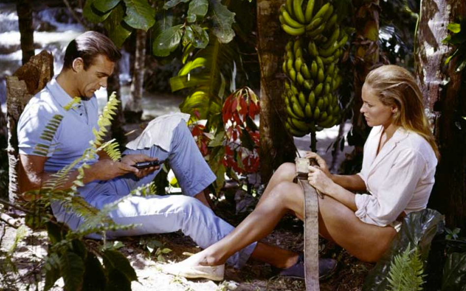 Ursula Andress jako Honey Ryder Scena, w której Honey Ryder wynurza się z morza w białym bikini, z muszlami w rękach i zarzuca blond włosy na plecy należy do jednej z najbardziej znanych w historii kina. Do dziś wielu uważa ją za pierwszą i jednocześnie najlepszą dziewczynę Bonda. James Bond wraz z Honey Ryder w „Doktorze No” wpada w ręce Dr No – szalonego multimilionera, członka organizacji SPECTRE (po polsku WIDMO), który za pieniądze ukradzione chińskiej mafii, w swoich tajnych laboratoriach prowadzi badania nad promieniotwórczością. Gdy Bond wydostaje się z celi, sabotuje próbę przejęcia rakiety kosmicznej i zabija przy tym Dr No, a na koniec ratuje uwiezioną dziewczynę, której grozi śmiertelne niebezpieczeństwo. Dryfująca łódź, na której płynie 007 i Panna Honey, odnajduje Leiter, agent CIA, wraz z marynarką brytyjską.