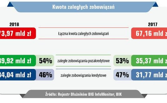W raporcie mowa o długach przeterminowanych powyżej 30 dni i na co najmniej 200 złotych. Na koniec minionego roku ponad 2, 78mln Polek i Polaków miało problem z terminową spłatą zobowiązań kredytowych i pozakredytowych. Łączna wartość ich zaległych długów wyniosła niemal 74 mld zł. Przez rok, przy uwzględnieniu opóźnień 30-dniowych, liczba dłużników zwiększyła się o blisko 93,8 tys. a kwota zaległości o 6,8 mld zł. To m.in. niespłacane kredyty mieszkaniowe, konsumpcyjne i pożyczki z firm pożyczkowych oraz rachunki za usługi telekomunikacyjne, telewizję kablową, prąd, gaz, czynsz, alimenty, grzywny, kary orzeczone przez sądy, opłaty karne za jazdę bez biletu, a także długi windykowane przez firmy windykacyjne.