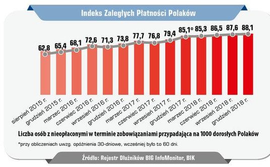 To wyniki najnowszej edycji „InfoDługu", ogólnopolskiego raportu o zaległym zadłużeniu i niesolidnych dłużnikach (dane na koniec 2018 r.), przegotowanego przez BIG InfoMonitor, Indeks Zaległych Płatności Polaków wynosi 88,1 punktów, czyli niemal 9 na 100 dorosłych Polaków nie radzi sobie z terminowym spłacaniem swoich zobowiązań finansowych.
