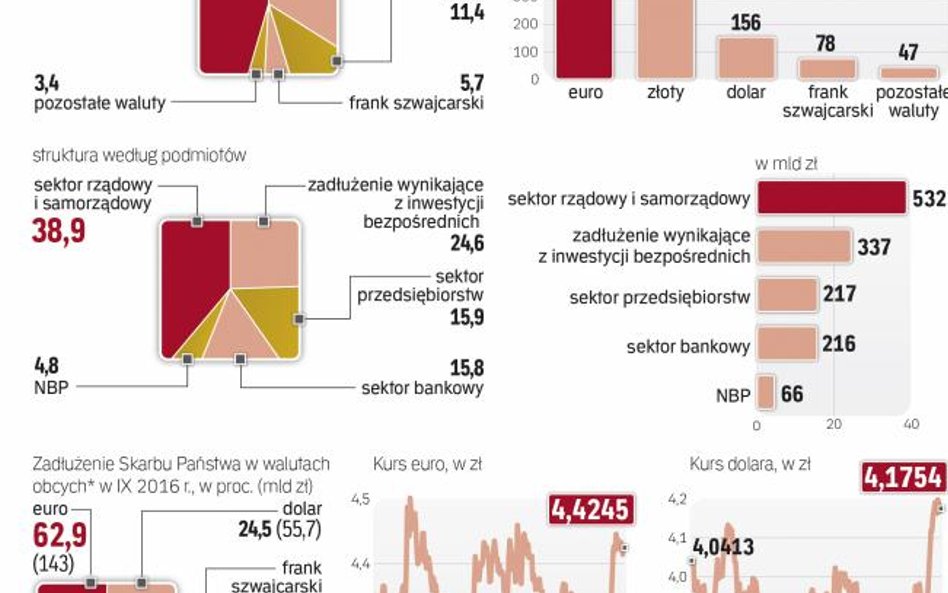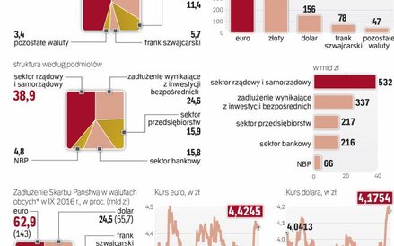 Jak wynika z danych NBP, zadłużenie zagraniczne Polski na koniec II kwartału wynosiło ok. 1,37 bln zł, a ciągu pierwszego półrocza w efekcie m.in. zmiany kursów walutowych zwiększyło się o ok. 25 mld zł. Z kolie zadłużenie samego Skarbu Państwa na koniec września tego roku przez słabą walutą zwiększyło się o 8 mld zł. Z szacunków „Rzeczpospolitej" wynika, że w całym 2016 r. straty z tego tytułu mogą sięgnąć nawet 13 mld zł (przy założeniu, że kurs walut na koniec roku utrzymałby się na wysokim listopadowym poziomie), co stanowioby 1,4 proc. całego długu Skarbu Państwa.