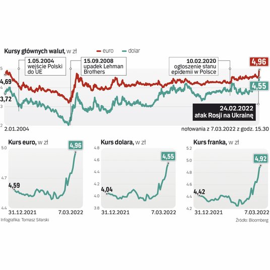 Po raz pierwszy w historii euro kosztowało wczoraj ponad 5 zł, podobnie frank szwajcarski. Najdroższy od początku wieku był dolar – 4,62 zł. Po południu złoty odrobił część strat, ale i tak pozostawał o 12,7 proc. słabszy wobec dolara i o 8,5 proc. słabszy wobec euro niż miesiąc temu. – Osłabienie złotego wynika z obaw uczestników rynku, że wywołana przez Rosję wojna przyniesie polskiej gospodarce konsekwencje w postaci znacznie wyższej inflacji, co przełoży się na zmniejszoną konsumpcję prywatną. Konflikt jest też źródłem wielkiej niepewności dla firm, które w najbliższym okresie mogą wstrzymać się z inwestycjami – tłumaczy „Rzeczpospolitej” Piotr Matys, analityk walutowy w In Touch Capital Markets w Londynie.