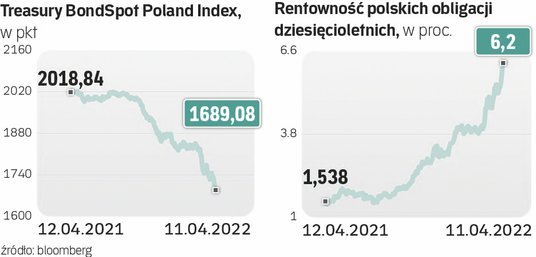 Nowy tydzień rozpoczął się od kontynuacji przeceny polskich obligacji skarbowych. Rentowności rosły wzdłuż całej krzywej nawet po ponad 20 pkt baz. Oprocentowanie obligacji dwuletnich przekraczało 6,61 proc., a dziesięcioletnich 6,25 proc. Poprzednio tak wysoko rentowności papierów długoterminowych znajdowały się w 2011 r. Tylko od początku tego roku indeks polskich obligacji TBSP stracił już około 8 proc., natomiast w całym poprzednim roku zniżka sięgała 9,7 proc. Obecnie indeks ten jest na poziomach sprzed nieco ponad pięciu lat. Podobnie cofnęły się notowania wielu funduszy dłużnych.