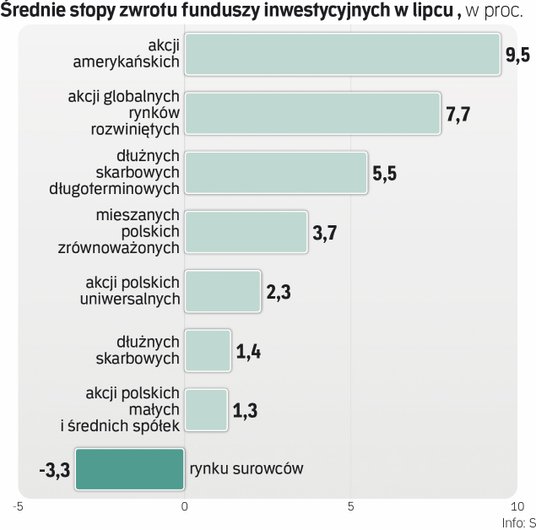 W lipcu notowania poprawiły oczywiście także pozostałe główne grupy funduszy dłużnych. Przykładowo w gronie funduszy papierów skarbowych krótkoterminowych przeciętny zysk wyniósł 1,37 proc., co zmniejszyło tegoroczne spadki do zaledwie 1,02 proc. Zyski zaczynają pokazywać również fundusze papierów korporacyjnych, które także powinny skorzystać na wyższych stopach. Średnio w lipcu zarobiły po 1,2 proc. Tu wynik od początku roku również pozostaje jeszcze na minusie około 2,39 proc.