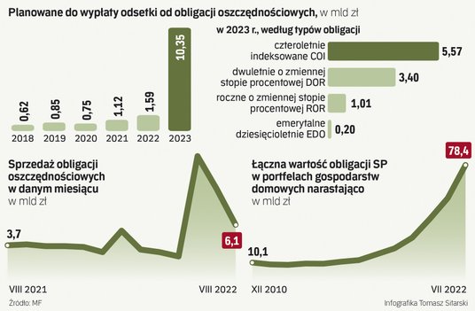 Jak wyjaśnia ekonomista Banku Pekao SA, spora część rządowych obligacji kierowanych do odbiorców detalicznych jest indeksowa inflacją lub w oparciu o wskaźniki związane w inflacją. Z projektu budżetu wynika, że najwięcej w przyszłym roku zarobić mają posiadacze czteroletnich papierów, gdzie odsetki od drugiego roku oszczędzania są równe inflacji (i powiększone o marżę) – to aż 5,57 mld zł. Tego typu instrumenty cieszą się największym zainteresowaniem Polaków, a w grudniu zeszłego roku kupił je też premier Mateusz Morawiecki.