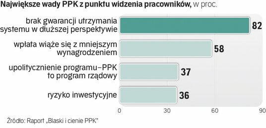 Oceniając PPK, blisko 80 proc. pracodawców i 82 proc. pracowników stwierdziło, że jego największą wadą jest brak jasno zdeklarowanej gwarancji utrzymania tego systemu w dłuższej perspektywie. Nieco ponad 40 proc. pracodawców i 58 proc. pracowników uznało za wadę fakt, że wpłata na PPK wiąże się z mniejszym wynagrodzeniem. Wśród wad badani wskazywali też to, że w ich ocenie PPK rodzi ryzyko inwestycyjne, a sam system jest upolityczniony, bo jest to program rządowy.