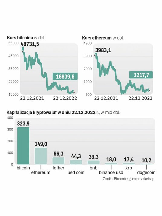 O ile w szczycie z jesieni 2021 r. kapitalizacja globalnego rynku kryptowalut sięgała 2,9 bln dolarów, to w czwartek po południu wynosiła już tylko 811 mld USD. Z tego 324 mld USD przypadało na bitcoina, czyli najbardziej popularną wirtualną walutę. Bitcoin stracił przez ostatnie 12 miesięcy 66 proc., a jego kurs wynosił w czwartek po południu około 16,8 tys. USD. Ethereum, czyli druga pod względem popularności kryptowaluta straciła w tym czasie prawie 70 proc., a jej czwartkowy kurs kształtował się na poziomie nieco ponad 1,2 tys. USD. Dogecoin, czyli kryptowaluta mocno promowana wcześniej przez miliardera Elona Muska, kosztował 7,7 centa, gdy w grudniu zeszłego roku jego kurs dochodził do 19 centów.