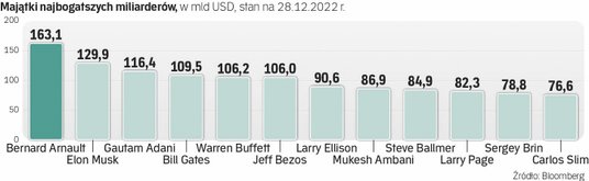 Z zestawienia „Forbesa” wynika, że majątek Elona Muska zmniejszył się od początku 2022 r. o 115 mld dol., podczas gdy bardziej aktualne dane z Indeksu Miliarderów Bloomberga wskazują, że Musk stracił w tym czasie 140,5 mld dol., a jego majątek spadł do 129,9 mld dol. W obu rankingach Musk spadł na drugie miejsce. Wyprzedził go Bernard Arnault, właściciel koncernu LVMH. Majątek tego francuskiego potentata też spadł jednak w tym roku – według Bloomberga – o 15 mld dol., do 163,1 mld dol.