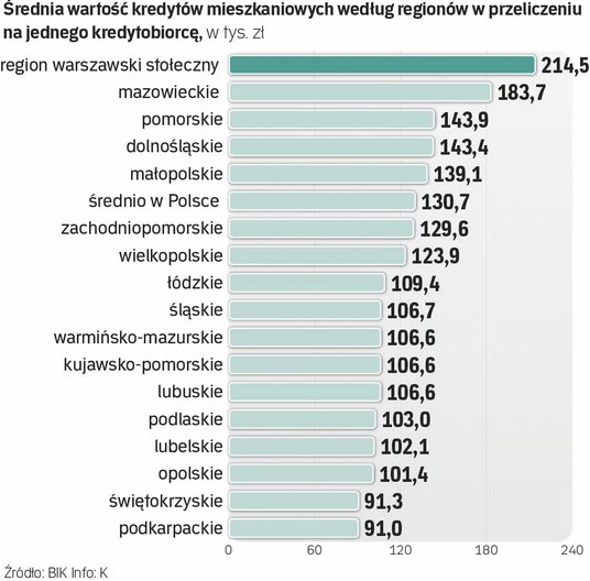 Mapa zadłużenia Polaków z tytułu potrzeb mieszkaniowych pokazuje bardzo duże różnice regionalne. O ile średni kredyt hipoteczny (w przeliczeniu na jednego kredytobiorcę) w regionie stołecznym warszawskim, jak wynika z danych prezentowanych przez Biuro Informacji Kredytowej, sięga obecnie aż ok. 214 tys. zł, o tyle na Podkarpaciu – „tylko” ok. 91 tys. zł.