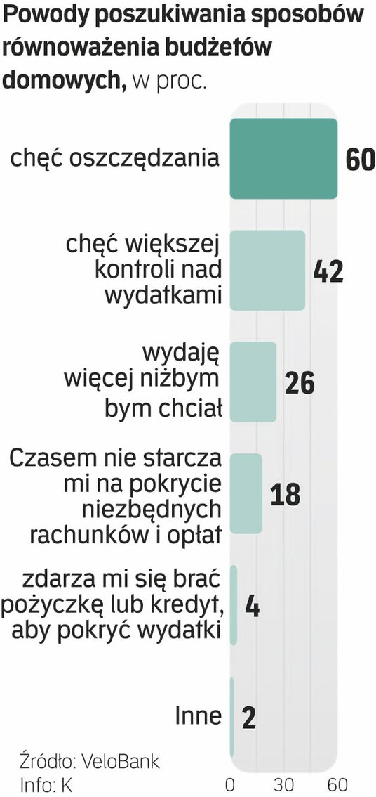 Takie wyniki przynosi badanie VeloBanku „Strategie Polaków w zarządzaniu budżetem domowym”. Wynika z niego ponadto, że motywacją dla równoważenia budżetu domowego jest najczęściej chęć oszczędzania, którą wskazało 60 proc. ankietowanych. To szczególnie ważne dla młodych osób (między 18. a 34. rokiem życia), gdzie ten odsetek sięgał 68 proc. Chęć odłożenia pieniędzy dzięki lepszemu gospodarowaniu domowymi finansami spada wraz z wiekiem. Wśród osób w wieku 55 lat i starszych deklaruje ją tylko nieco ponad połowa (54 proc.). Drugim powodem, dla którego Polacy chcą równoważyć swoje wydatki na utrzymanie domu, jest chęć uzyskania nad nimi większej kontroli (42 proc.). Nieco więcej niż co czwarty respondent w badaniu VeloBanku wskazywał, że potrzebuje lepszego balansu, bo wydaje więcej, niżby tego chciał, a 18 proc. poszukuje równowagi, bo czasem nie starcza na pokrycie niezbędnych rachunków. 4 proc. chciałoby uniknąć sytuacji, w której musi brać pożyczkę lub kredyt, aby opłacić niezbędne wydatki, co teraz im się zdarza.