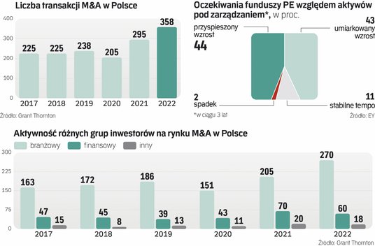 Za optymistycznym scenariuszem może przemawiać sytuacja na polskim rynku. Kilka podmiotów pozyskało znaczące środki do nowych funduszy i wiele wskazuje, że branża będzie w 2023 r. aktywną stroną na rynku fuzji i przejęć. W Polsce w 2022 r. miał on wartość 19,6 mld euro, czyli wyższą o 22 proc. wobec 2021 r. – wynika z danych Mergermarket przygotowanych dla EY. Z kolei liczba transakcji poszła w górę o 46 proc., do 372.