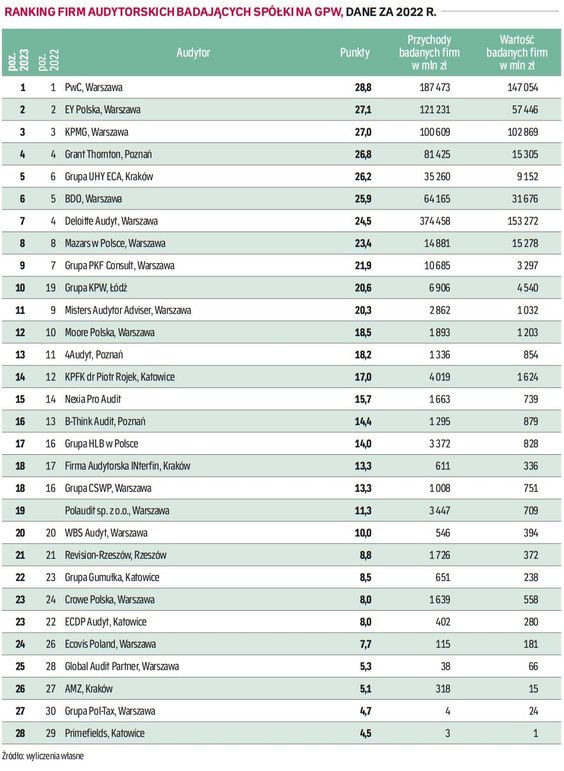 Rok temu czwarte miejsce było podwójne: tyle samo punktów miały Deloitte i Grant Thornton. W najnowszej edycji na tym miejscu uplasował się już tylko Grant Thornton, a Deloitte spadło o trzy pozycje. Przed nim zmieściły się jeszcze UHY ECA i BDO. W pierwszej dziesiątce znalazły się również Mazars, PKF Consult i Grupa KPW.