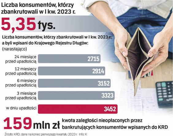 Dane Centralnego Ośrodka Informacji Gospodarczej za pierwszy kwartał 2023 r. pokazują niepokojący wzrost upadłości wśród polskich konsumentów. W ciągu zaledwie trzech miesięcy bankructwo ogłosiły 5352 osoby, co odpowiada 1/3 ich liczby w całym 2022 r. Porównując pierwszy kwartał ub.r. z obecnym, widoczny jest skok aż o 55 proc. W marcu 2023 r. liczba upadłości konsumenckich po raz pierwszy przekroczyła 2 tys. COIG przewiduje, że obecny rok może być rekordowy i liczba niewypłacalności może przekroczyć 20 tys.