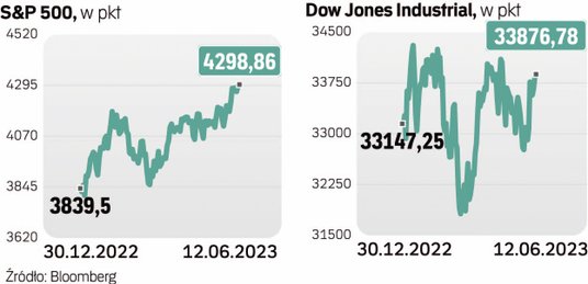 S&P 500 oficjalnie wszedł w zeszłym tygodniu w rynek „byka”, zyskując od październikowego dołka ponad 20 proc. Wcześniej zrobiły to już m.in. Dow Jones Industrial, Nasdaq Composite i Russell 2000. Nadchodzące dni będą jednak dużym testem dla amerykańskiego i globalnego rynku akcji. We wtorek na nastroje inwestorów mogą mocno wpłynąć dane o inflacji konsumenckiej w USA. Średnio prognozowane jest jej wyhamowanie z 4,9 proc. w kwietniu do 4 proc. w maju, a inflacji bazowej (czyli nieobejmującej zmian cen żywności, paliw i energii) – z 5,5 proc. do 5,3 proc.
