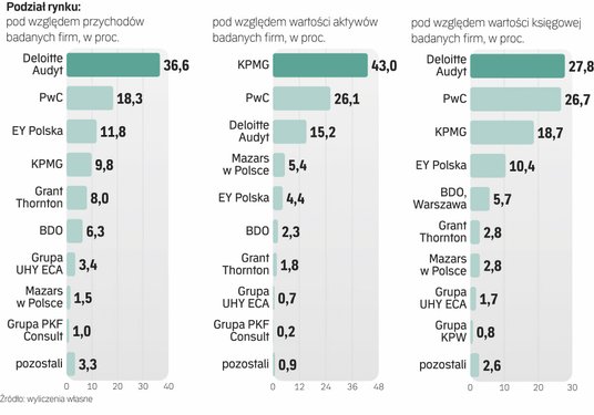 Gdybyśmy mierzyli rynek przychodami audytowanych firm, to na Deloitte przypada najwięcej: niemal 37 proc. Drugi jest EY, ale od Deloitte dzieli go aż 18 pkt proc. Deloitte jest też liderem zestawienia pod względem wartości księgowej badanych firm. Przypada na niego prawie 29 proc. rynku. Natomiast pod względem wartości aktywów audytowanych klientów jest trzeci – za KPMG i PwC, a biorąc pod uwagę liczbę badanych firm, zajmuje miejsce poza pierwszą dziesiątką. Tutaj liderem jest UHY ECA, a za nią plasują się Grant Thornton, PwC, BDO, EY Polska, KPMG oraz 4Audyt.