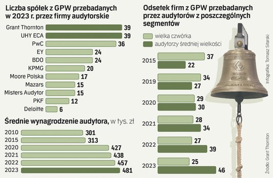 Z publikowanych przez Grant Thorntona raportów wynika, że w zeszłym roku średnie wynagrodzenie audytora wzrosło do 481 tys. zł, z 457 tys. zł, czyli o 5,3 proc. To o ponad połowę mniej niż zeszłoroczna dynamika wynagrodzeń oraz inflacja. Wynagrodzenie audytorów było też znacznie poniżej dynamiki przychodów badanych spółek. Ona sięgnęła 30 proc. To już kolejny rok z rzędu, kiedy ceny audytu spółek giełdowych rosną wolniej niż otoczenie rynkowe. Czy to oznacza, że de facto spadają? Na takie wnioski za wcześnie. Można mówić raczej o stabilizacji, biorąc pod uwagę zmianę struktury rynku i kształtowanie się wynagrodzeń za audyt w poszczególnych segmentach. Z raportu Grant Thorntona wynika, że ceny największych firm audytorskich są znacząco wyższe niż średnich i małych.