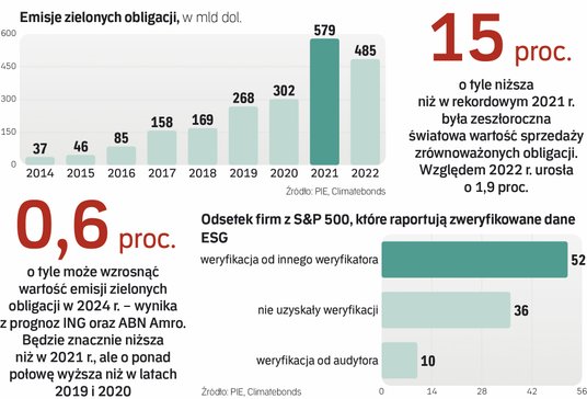 Sprzedaż zielonych obligacji jest nadal znacznie niższa niż w rekordowym 2021 r. W 2022 r. spadła o 16 proc., a w 2023 r. odbiła w górę o zaledwie 1,9 proc. Prognozy na 2024 r. zakładają jeszcze niższą, niespełna 1-proc. dynamikę – wynika z raportu Polskiego Instytutu Ekonomicznego, bazującego m.in. na danych ING i ABM Amro.
