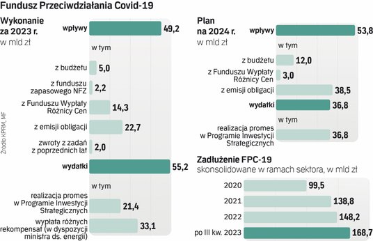 „Rzeczpospolita” poprosiła KPRM o przedstawienie wykonania planu finansowego FPC-19 za zeszły rok oraz o plan finansowy na bieżący. W 2024 r. wpływy będą wyższe, a wydatki niższe – wynika z założeń rządu. Zmieni się też główna dziedzina, na którą zostaną wydane pieniądze – dostaną je samorządy w ramach udzielonych już promes na inwestycje realizowane z Programu Inwestycji Strategicznych i Rządowego Programu Odbudowy Zabytków.