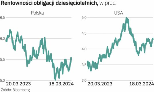 Również w Stanach Zjednoczonych od ponad tygodnia dochodowości papierów skarbowych rosną, a ceny spadają. W ostatnich dniach oprocentowanie tamtejszych obligacji dziesięcioletnich wzbiło się powyżej 4,3 proc., ale oznacza to jedynie dotarcie do szczytów z połowy lutego. W tym samym czasie oprocentowanie krajowych obligacji dziesięcioletnich na zamknięciach nie przekraczało 5,5 proc.