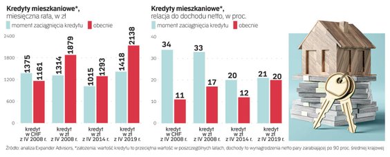 W naszej analizie braliśmy pod uwagę cztery przykładowe kredyty mieszkaniowe zaciągnięte w różnych latach i w różnych walutach. Największy zaś spadek obciążeń w relacji do dochodów dotyczył złotowych hipotek z 2008 r.