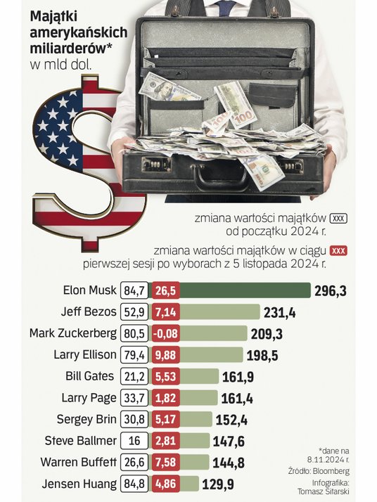 Oczywiście nie tylko Musk wzbogacił się w ciągu pierwszych sesji giełdowych od dnia wyborów prezydenckich w USA. Indeksy z Wall Street (i wielu innych rynków akcji na świecie) zareagowały bardzo pozytywnie na wybór Trumpa na prezydenta. Zyskiwały na wartości akcje należące zarówno do miliarderów, jak i do drobnych inwestorów. To jednak wzrost wartości majątków najbogatszych ludzi na świecie był najbardziej spektakularny. Był to największy skok bogactwa w tak krótkim czasie, odkąd Bloomberg zaczął w 2012 r. codziennie wyliczać majątki miliarderów.