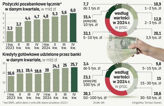 Instytucje pożyczkowe uzyskały znaczącą dominację, jeśli chodzi o finansowanie potrzeb Polaków na niskie kwoty – wynika z ostatniego, rocznego raportu Biura Informacji Kredytowej. W przypadku „zwykłych” pożyczek i kredytów gotówkowych w wysokości do 1 tys. zł ich udział wynosi ok. 85 proc., podczas gdy w całym tym rynku – ok. 13 proc.