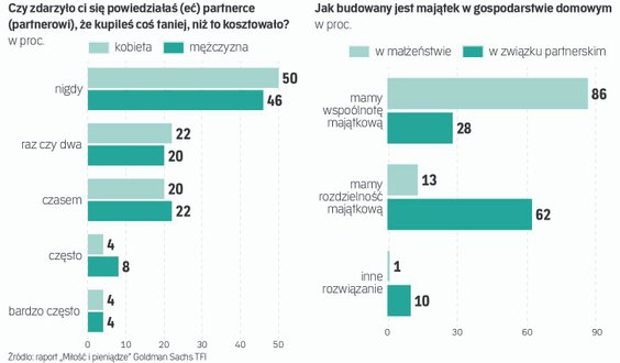 – Wspólny budżet w związku sprzyja szczęściu i satysfakcji partnerów, niezależnie od tego, czy to związek partnerski, czy małżeński – uważa prof. UW dr hab. Katarzyna Sekścińska, autorka badania „Miłość i pieniądze” przeprowadzonego dla Goldman Sachs TFI. Dodaje, że finansowe funkcjonowanie polskich par jest bardzo zróżnicowane: Choć wiele osób deklaruje wartość dialogu na temat pieniędzy dla dobrej relacji w związku i widzi zagrożenia wynikające z niezależnego mierzenia się z decyzjami finansowymi, to w rzeczywistości nie wszyscy partnersko podchodzą do kwestii finansowych. Sekścińska wskazuje, że z badania „Miłość i pieniądze” wynika także, iż zadowolenie ze związku w przemożny sposób wiąże się z tym, jak pary zarządzają finansami. A ogólny dobrostan człowieka jest związany z zadowoleniem ze związku i z funkcjonowaniem pary w świecie finansów.
