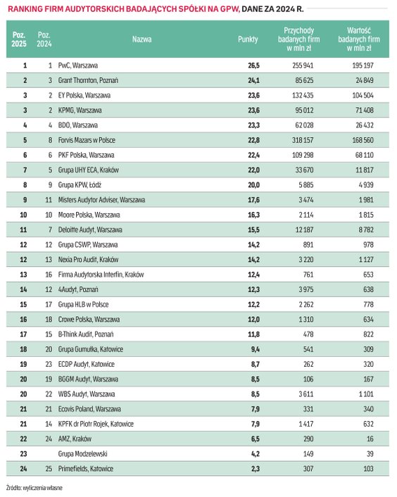 Najnowsza edycja pokazuje imponujący awans Grant Thornton, który przeskoczył EY i KPMG, wskakując na pozycję wicelidera (24,1 pkt). Pierwsze miejsce niezmiennie ma PwC (26,5 pkt), z kolei EY i KPMG znów zebrały tyle samo punktów (23,6) i razem zajmują trzecie miejsce. Wysoką czwartą pozycję utrzymało BDO. Od miejsca na podium dzieli tę firmę zaledwie ułamek punktu. Wyraźny awans odnotowało Forvis Mazars, które uplasowało się na piątej pozycji.