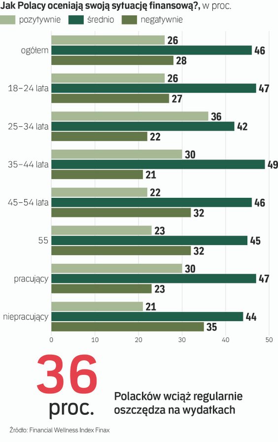 Autorzy badania zauważają, że wśród osób o bardzo niskiej wartości wskaźnika najwięcej jest kobiet i osób w wieku 45–54 lata. Wyższe oceny sytuacji finansowej widać zaś wśród mężczyzn, a także „zetek” i młodych milenialsów, czyli osób w wieku 25–34 lata. W badaniu Finax 36 proc. Polaków przyznało, że regularnie oszczędza. Jednocześnie co czwarta osoba w ostatnich trzech miesiącach odczuwała wysoki stres w związku ze swoją sytuacją finansową.